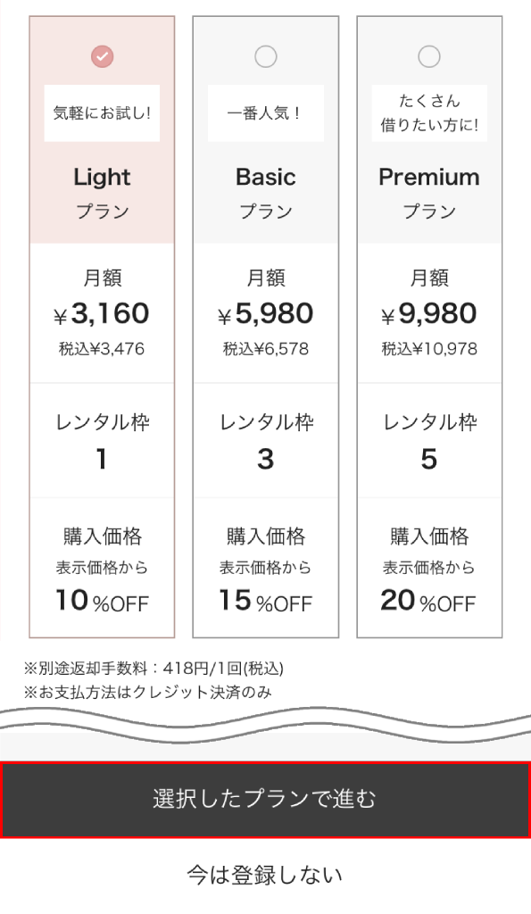 レンタル枠が1枠のLightプランの月額料が