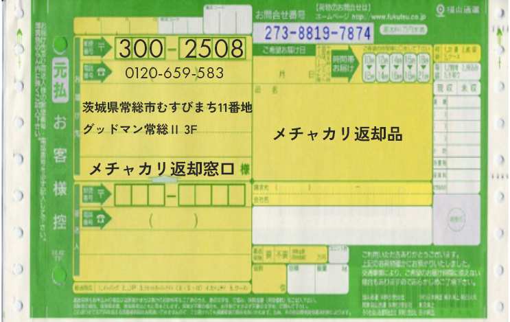メチャカリ返却窓口 宛て