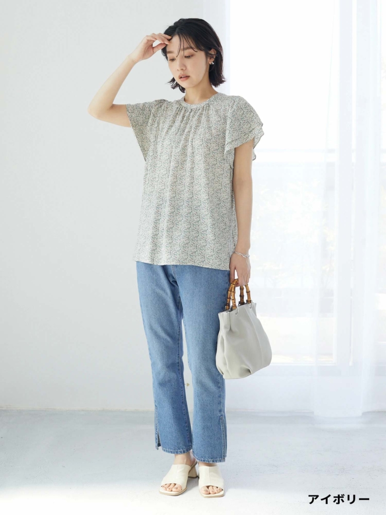 ふんわりとしたショルダーフリルと胸元のギャザーで、レディライクな印象に。