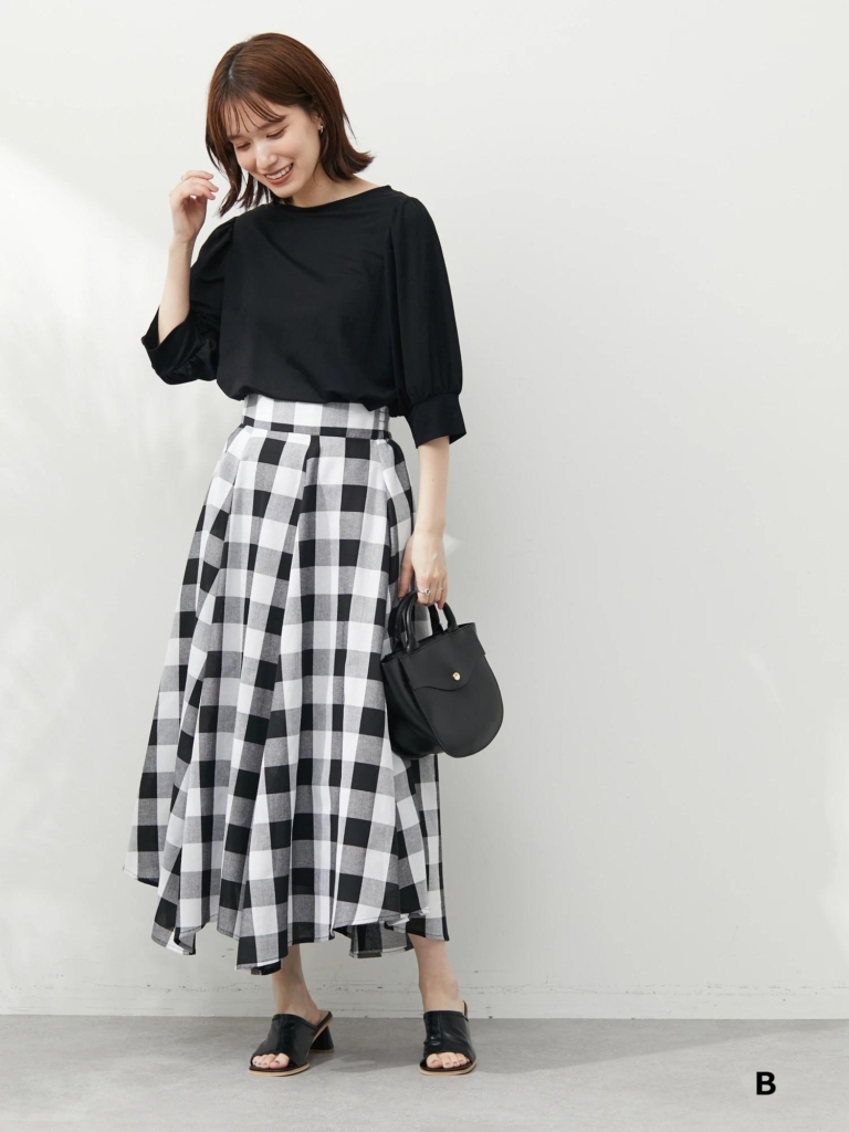 大人可愛い雰囲気を醸し出す、チェックスカート。モノトーンでまとめると上品なコーデが完成します。