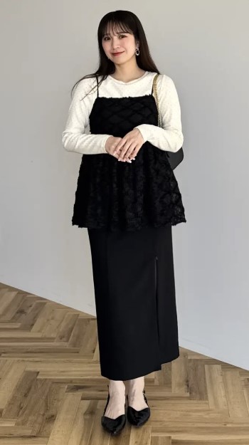 程よい弾力のある素材感が身体のラインを拾いにくく、美しいシルエットを長時間キープ◎