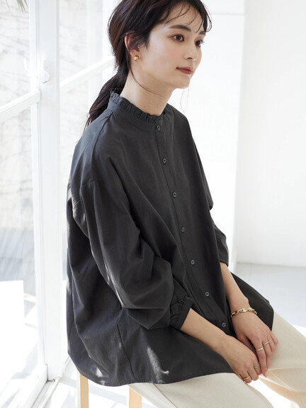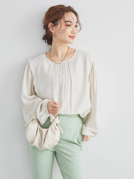 とろみ素材のブラウスは、ふんわりと広がるバルーン袖がエレガントな印象を生み出します。