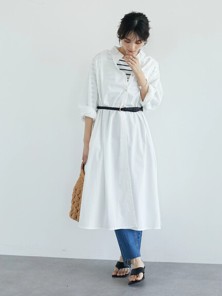 また、ベルトを巻くとより細身に見えるなど、ロングシャツ一着でさまざまな雰囲気が演出できます。