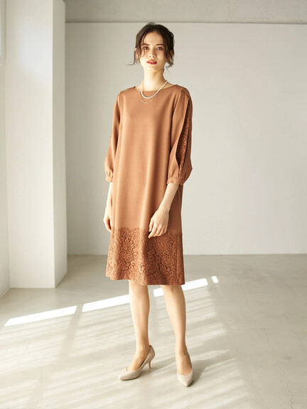 裾や袖のレース使いがドレッシー感を醸し出すワンピースは、程よくドレスアップしたディナーデートコーデに最適です。シンプルなデザインながらも、レース使いによって艶っぽさを感じる一着。