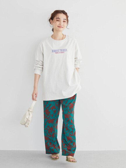よりリラクシー感をアップするには、ボトムスにもワイドサイズの柄物を使う着こなしがマスト。