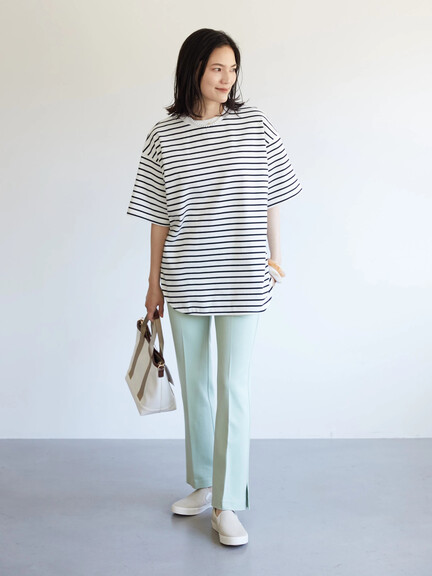 運動会で着こなしたい涼し気コーデには、ポンチのフレアパンツとワイドカットソーのコーデはいかがでしょうか?