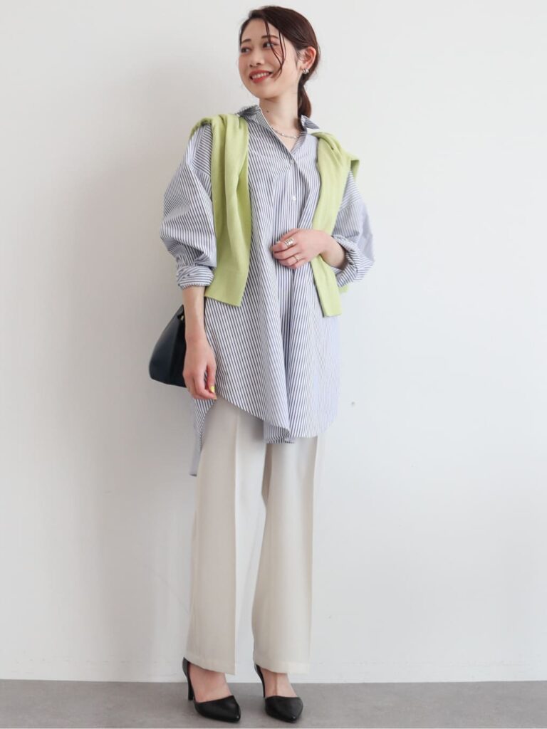 カーディガンやジャケットを羽織ってのスタイルにもマッチするので、気温によって合わせやすいスタイルです。