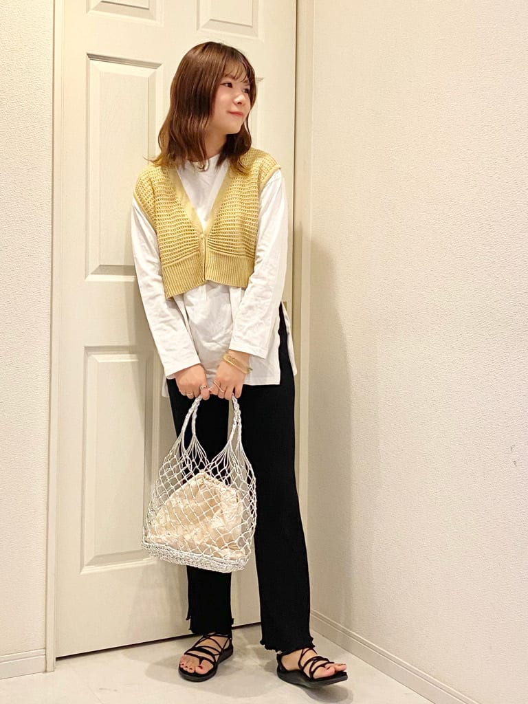 カットソーの上に黄色のメッシュニットビスチェをレイヤードするだけで、一気にトレンド感たっぷりなコーデに変身します。