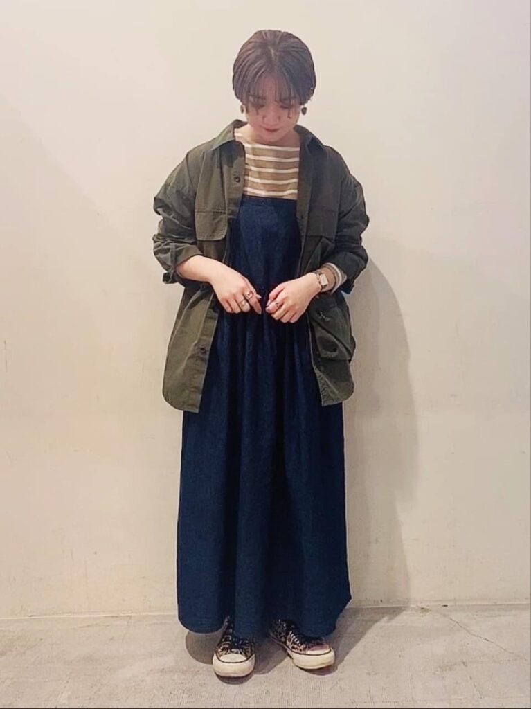 デニムはカーキのアイテムと一緒に着用すると、カジュアルさが増します。ボーダーなどの柄付きインナーを入れても、かわいく着られます。