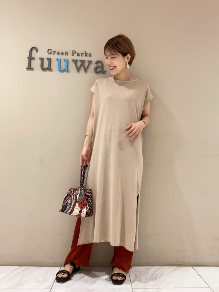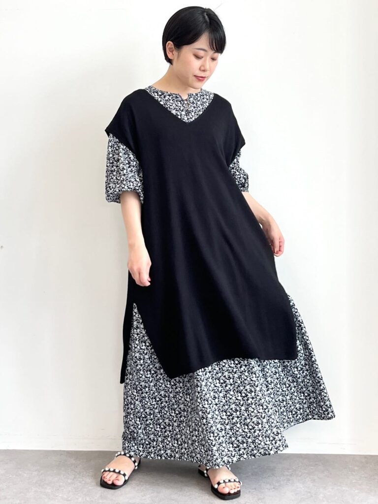 マキシ丈のワンピースも、素足を見せるのではなくあえてパンツを重ね着することで、細長いシルエットになります。
