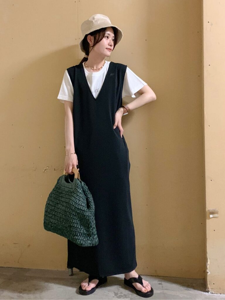 夏はインナーはTシャツ、靴はサンダルを合わせる、インナーをタンクトップやキャミソールにして、ノースリーブワンピースとして楽しんでみる。