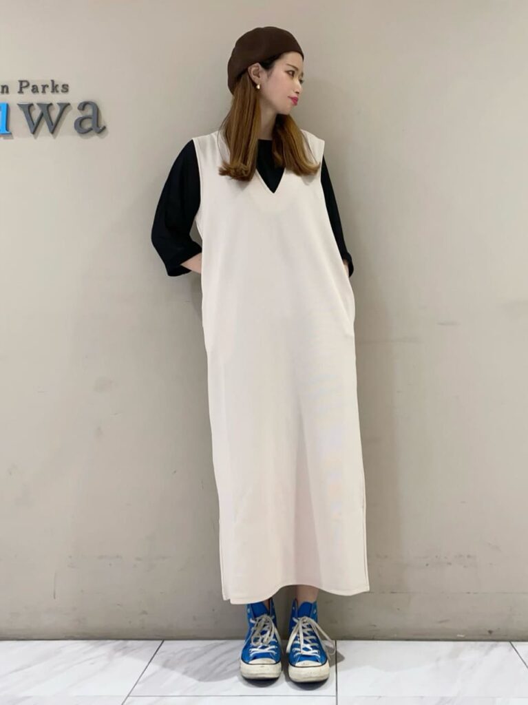1枚で主役になるワンピースですが、フロントに深いV字カットが施されたワンピースは、インナーのトップスによって印象が大きく変わるアイテム!