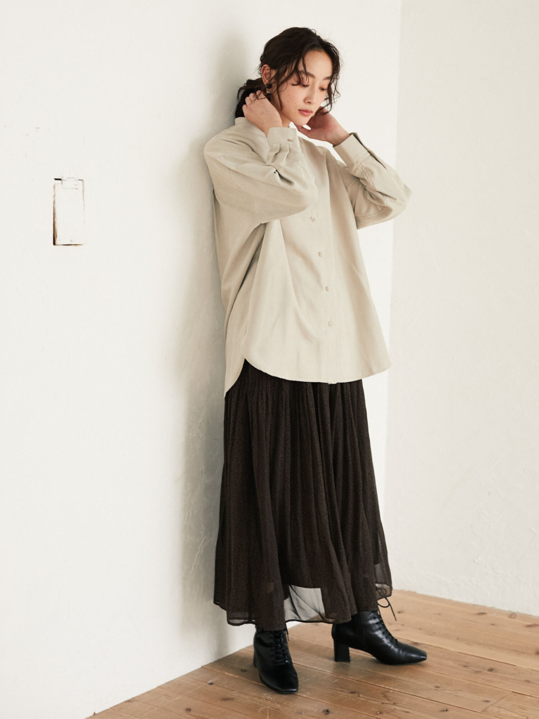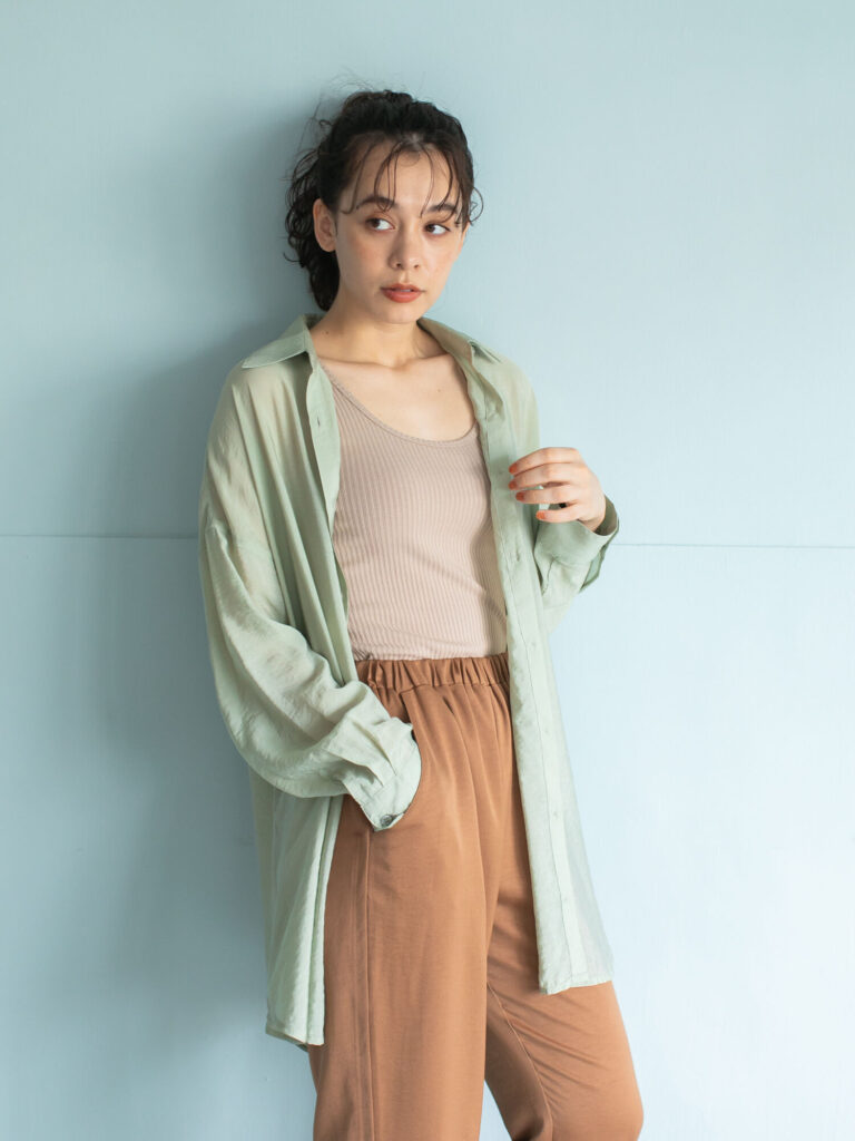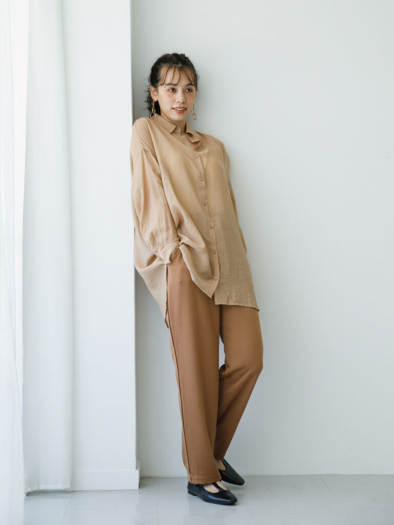 アースカラーのワントーンコーデに程良くメリハリを加えるシアーシャツ。淡く透け感のあるシャツだから、色物を加えても全体の雰囲気を壊しません。