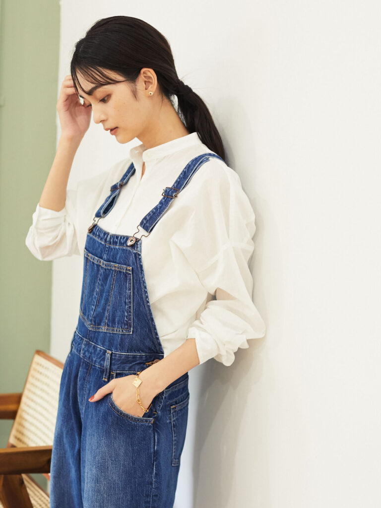サロペットのような存在感のあるアイテムは、ついついコーデがラフな印象に寄りがち。あえて上品なシャツを合わせることで、バランスのとれた大人カジュアルが叶います。