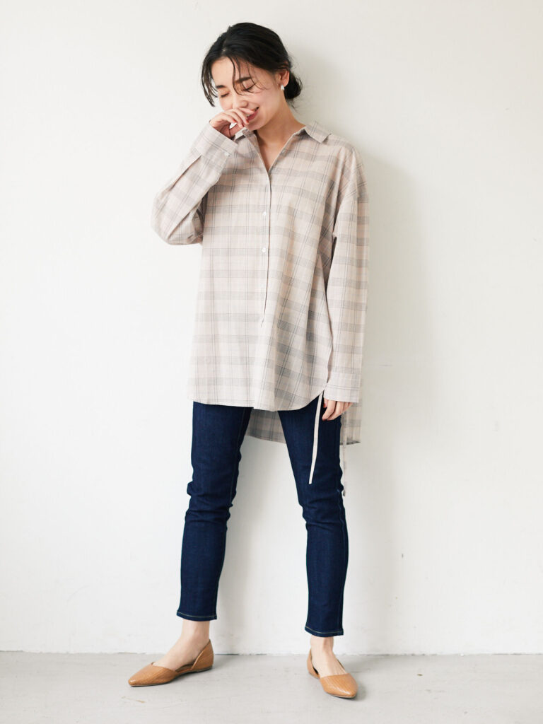 気になるお尻まわりのボリュームも、シャツの着丈が長いものを選んでカバーすれば、全体的なスタイルアップが可能です。