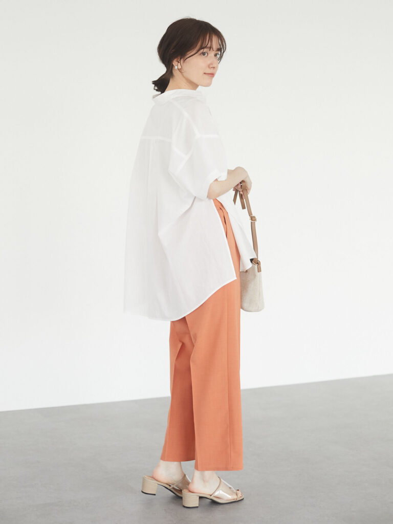 白のスキッパーシャツは、カラーパンツとの相性も抜群!シャツ×パンツというシンプルになりがちなコーデも、差し色を入れるだけで華やかな印象に変化します。