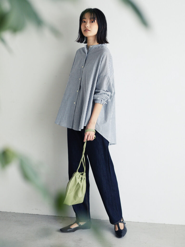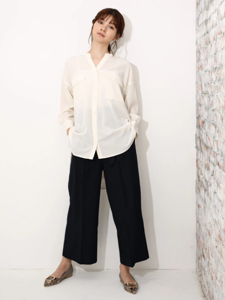 立襟になったバンドカラーのシャツは、三角襟のレギュラーシャツよりも上品で柔らかな雰囲気をまとっているのが特徴です。