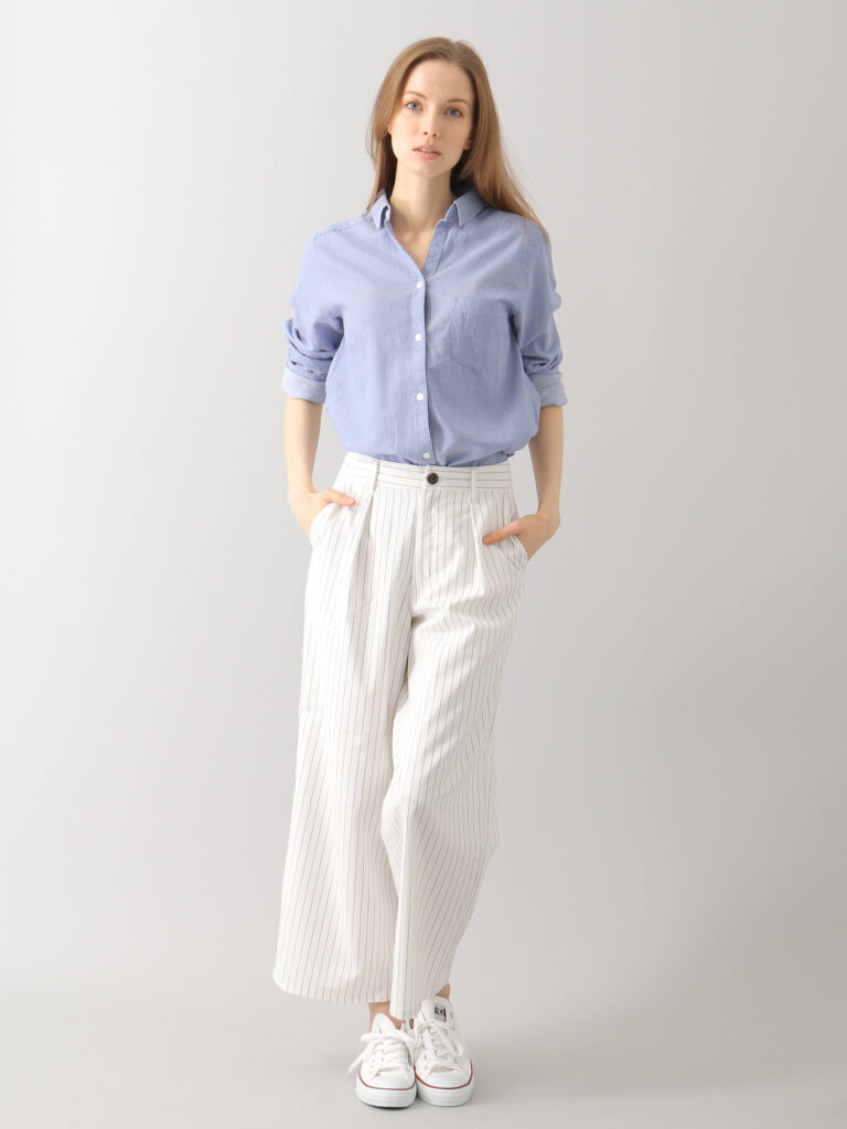 例えば、ブルーのシャツにホワイトパンツを合わせれば、爽やかなマリンルックに。裾をパンツにインすればメリハリが加わり、アクティブで上品なスタイリングになります。