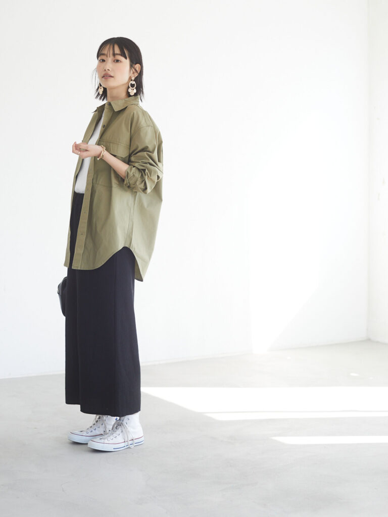 ワークシャツのような無骨なデザインには、スニーカーがよく映えます。ボトムスや小物などでフェミニンなアイテムを取り入れれば、カジュアルさとかわいらしさのバランスをうまくとってくれますよ。