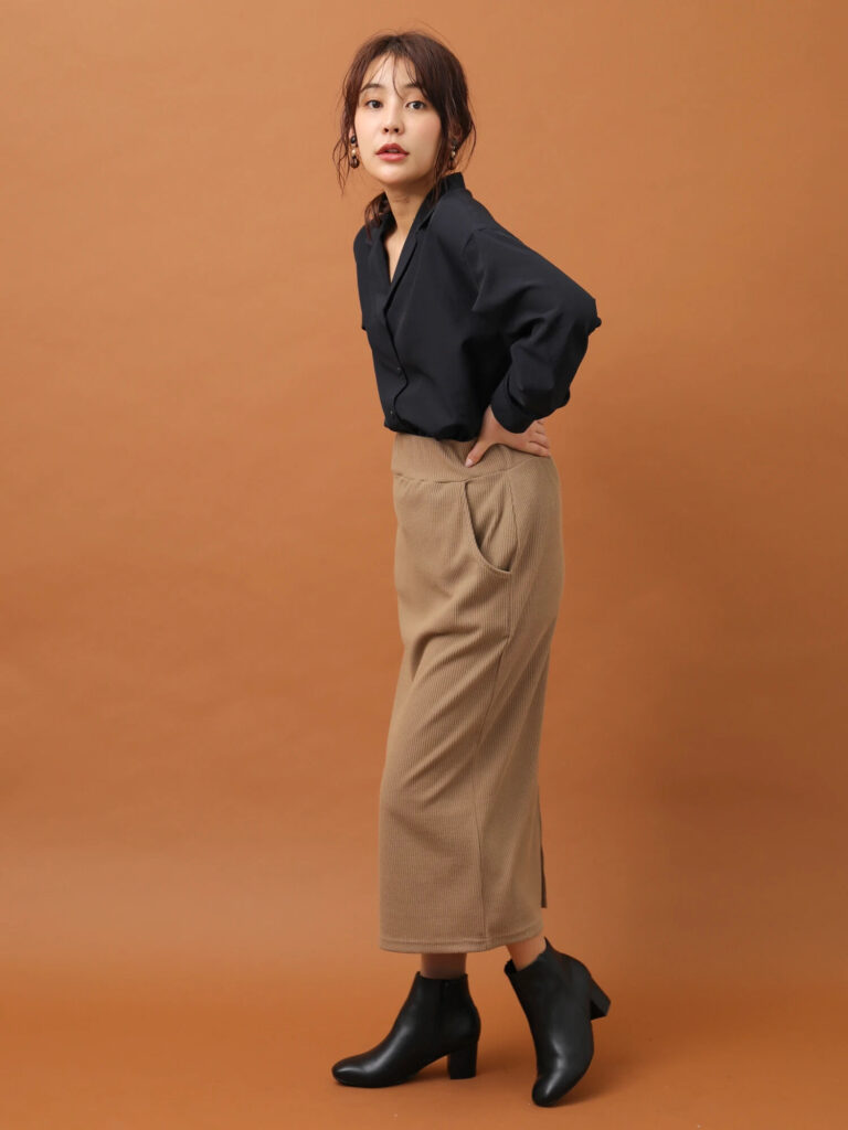例えば、写真のようにサイドスリットが入っているタイプを選ぶと、ウエスト位置が見えるため、脚長効果が期待できます。