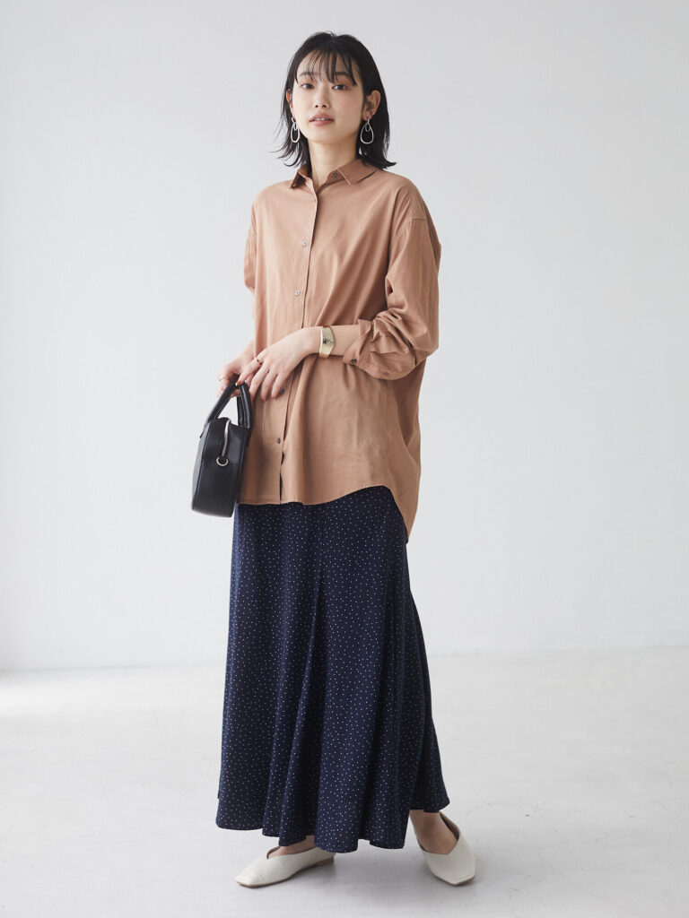 シャツ自体に落ち着いていて清楚な雰囲気があるため、オフィスのONコーデは考えやすいでしょう。合わせるアイテムを変えれば、いろいろな雰囲気が演出できます。