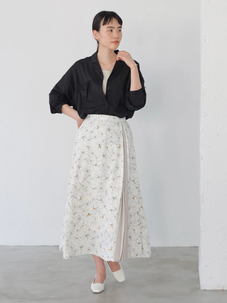 フェミニンンな花柄スカートと合わせたコーデは、インナーを見せてコントラストを利かせるのがポイント◎