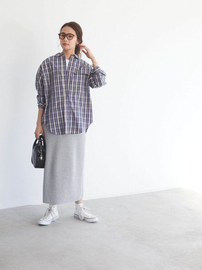 スウェットのロングスカートに、オーバーサイズのチェックシャツを組み合わせれば、バランスのとれた大人カジュアルの完成!