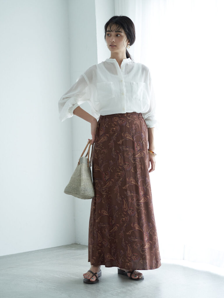 トレンド感のあるヴィンテージスカートにも、白シャツはベストマッチ!Tシャツやカットソーと合わせるよりも、大人の余裕感を持ったスタイルに仕上がります。