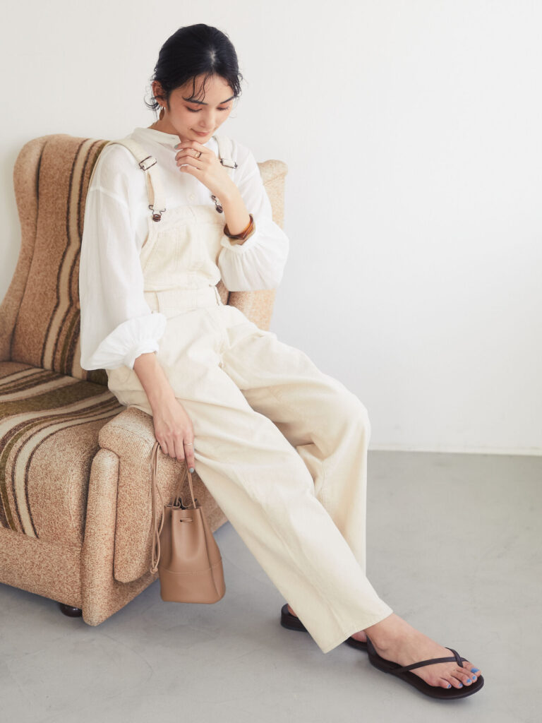 白シャツコーデで脱マンネリを図りたいなら、白のサロペットと合わせたワンカラーコーデに挑戦してみませんか?
