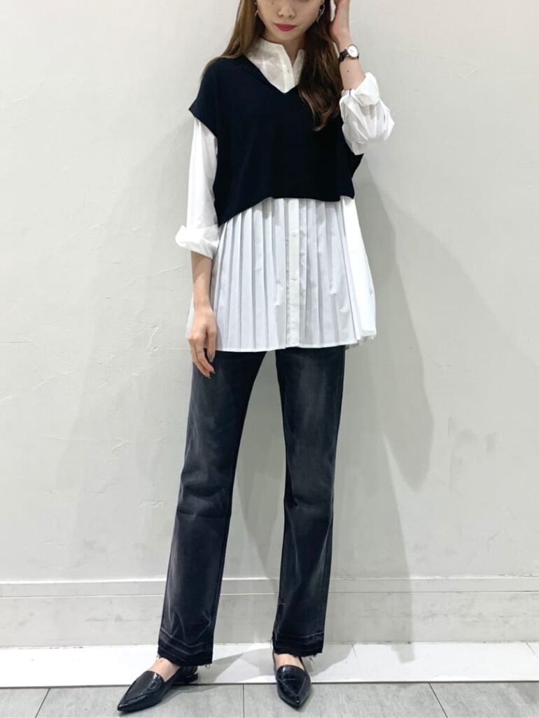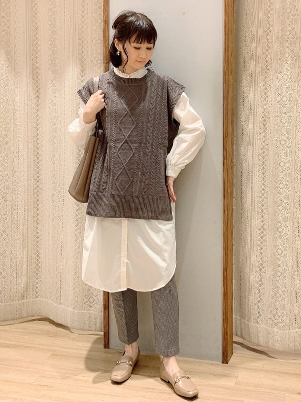 シャツはベストとも好相性◎秋コーデには、シャツの存在感を引き立ててくれるニットベストとのスタイリングを楽しんでみましょう!