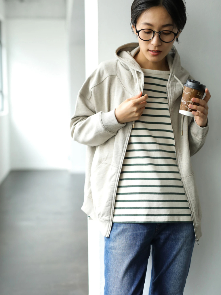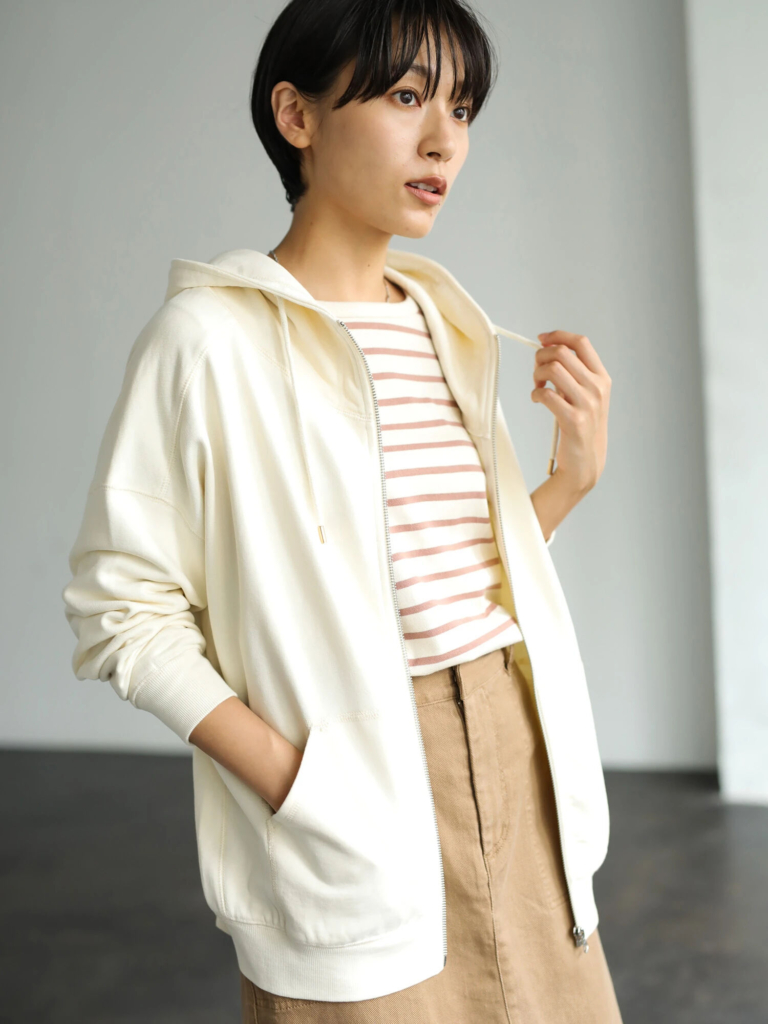 「パーカー」も、ミニマリストのワードローブに欠かせません。流行に左右されにくいので長く着ることができ、かつ定番アイテムなので着回し力も抜群です。