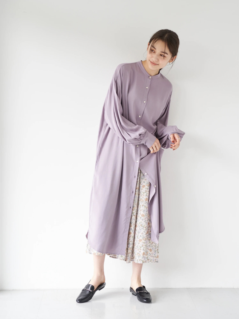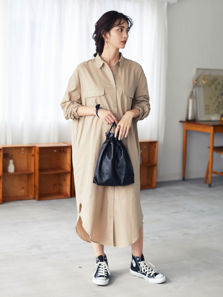 シンプルな「ロングシャツ(シャツワンピース)」も、用意しておきたいアイテムです。1枚あるだけでコーデにバリエーションが生まれます。