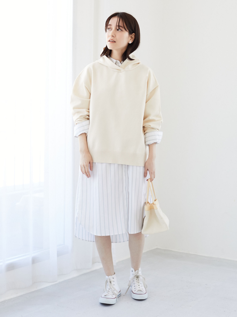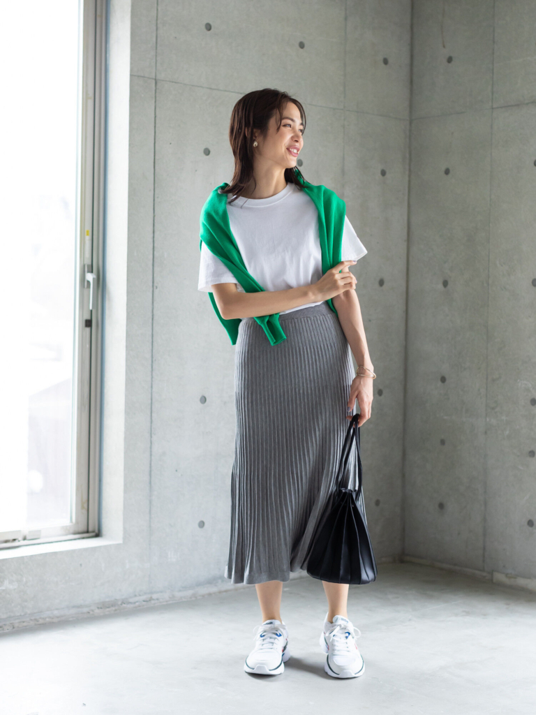 身長に合わせて、パンツ・スカートのどちらにも取り入れやすい着丈を選ぶこともポイントです。