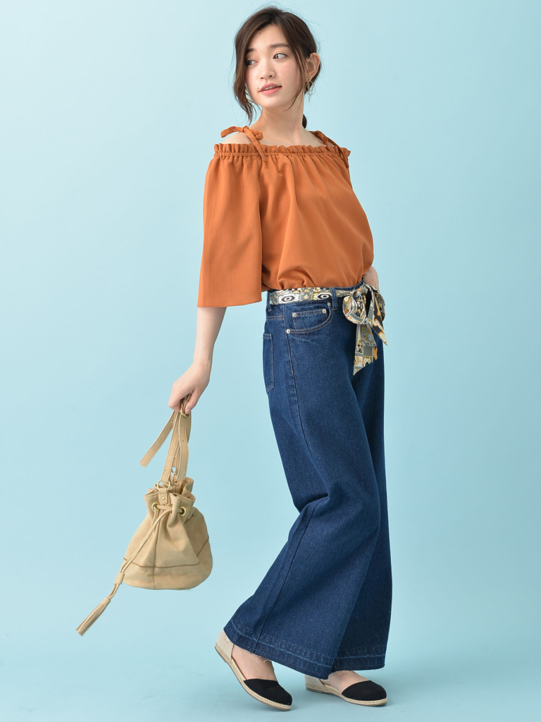 ボトムスにトップスをタックインしたときにベルトで差し色をすれば、ウエストの引き締め効果も期待できます。