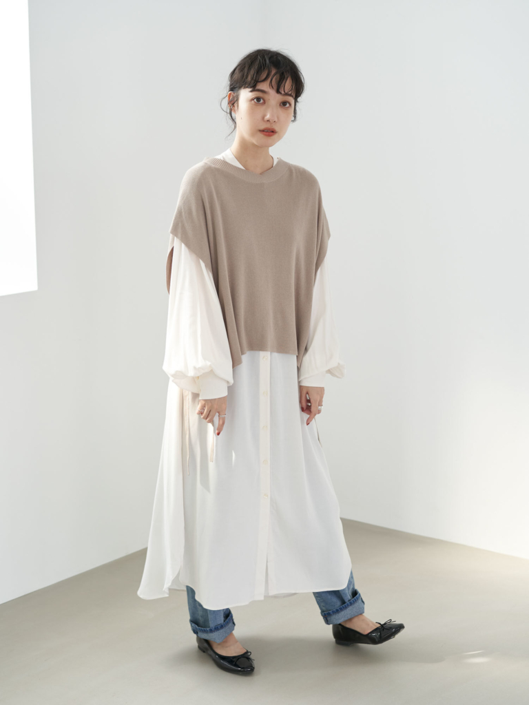 例えば、シャツワンピース×デニムの定番のカジュアルコーデも、ベストを重ねるだけでクラシカルな雰囲気に早変わり。基本のアイテムをモノトーンでそろえているなら、あえてカラフルなベストをワードローブに加えるのもおすすめです。