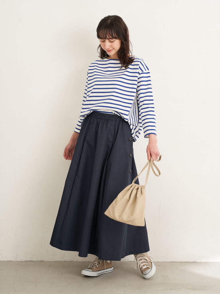 ベージュは中間色なので、合わせる色味によってはぼやけて見えてしまいます。黒アウターとの組み合わせなら、コントラストがはっきりしクールさが引き立ちます。コーデをのっぺりさせないためにも、ボーダーカットソーは白黒のものがgood。