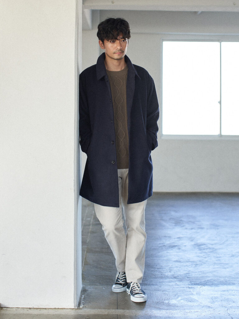 ただし、インナーにケーブルニットをチョイスしたことで、コーデ全体の雰囲気に柔らかな印象を与え、キリッとしすぎないスタイリングに。