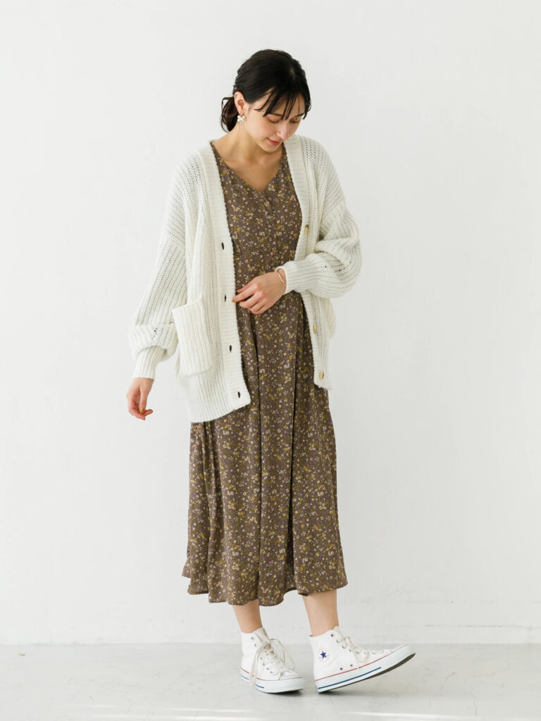 清潔感のある白のカーディガンと合わせることで、華やかな装いに仕上げましょう。