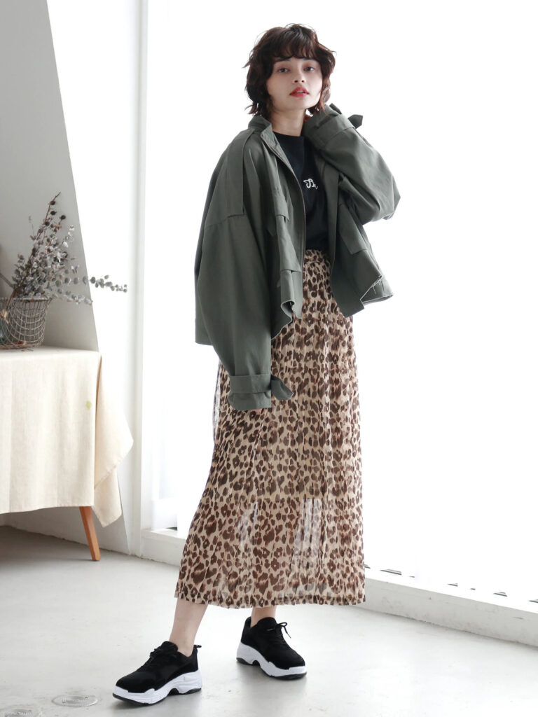 ミリタリージャケットはシンプルで着まわしやすいのが特徴。どんなボトムスと合わせてもおしゃれに決まります。ガーリーなプリーツスカートを合わせて甘辛コーデに仕上げるのが今風。