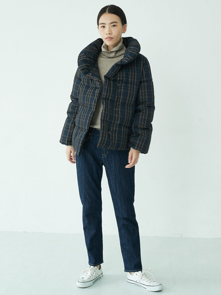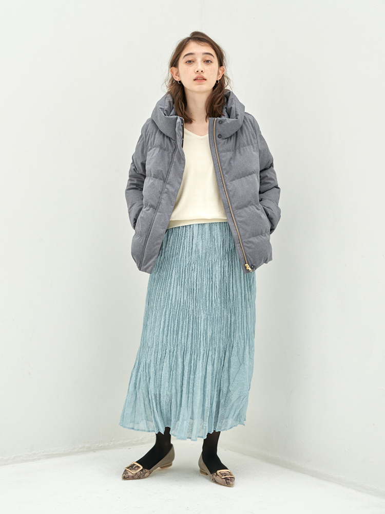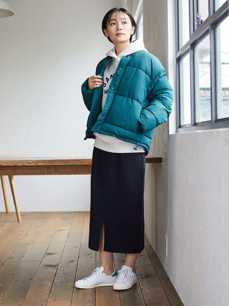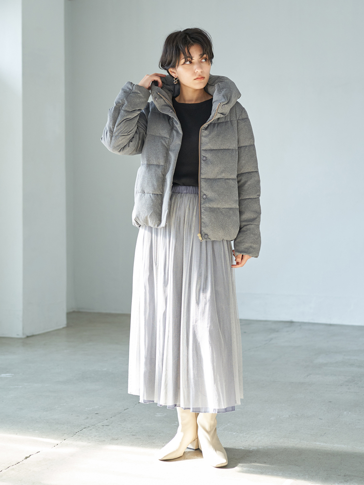 ボリュームのあるダウンジャケットも、ボトムスにタイトスカートを合わせればすっきり着こなせます。