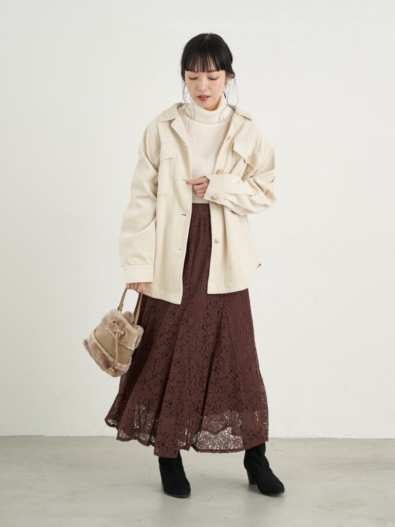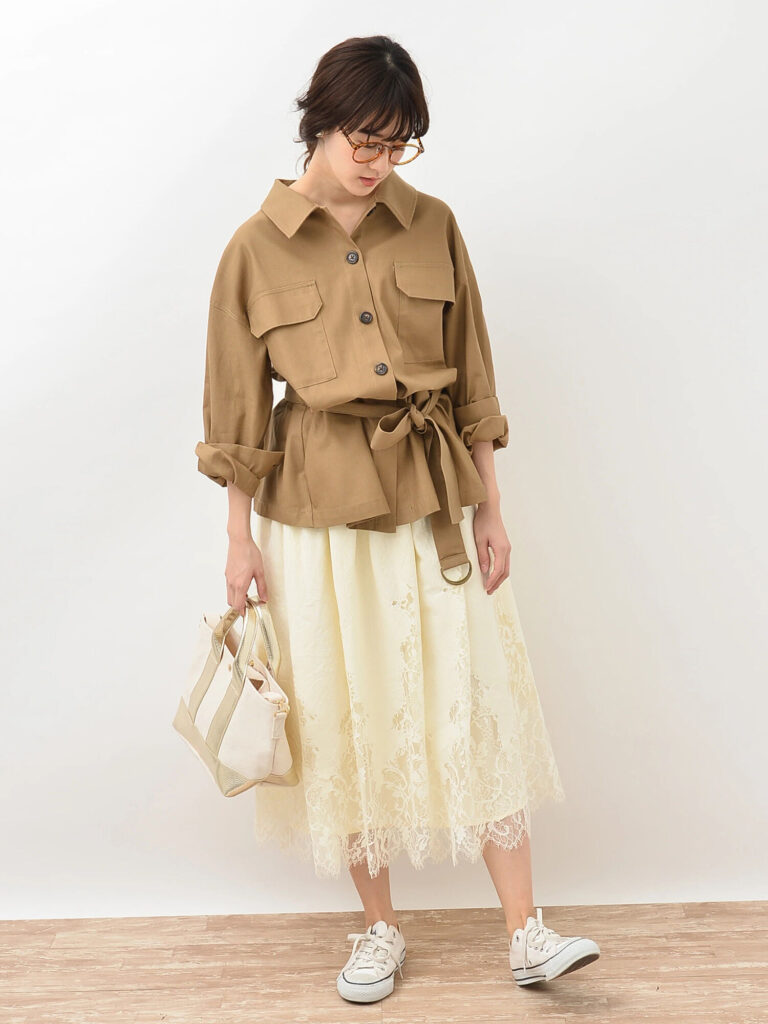 シャツジャケットのボトムスにガーリースカートを持ってくると、甘すぎずカジュアルすぎない絶妙なバランスのおしゃれが叶います。