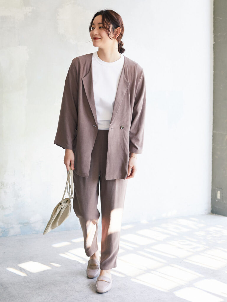 上下のセットアップにあえてノーカラージャケットを合わせることで、カチっとしすぎない抜け感のあるコーデが完成します。ビジネスシーンでも、女性らしい柔らかな雰囲気を出したいという場合におすすめです。