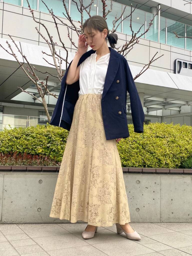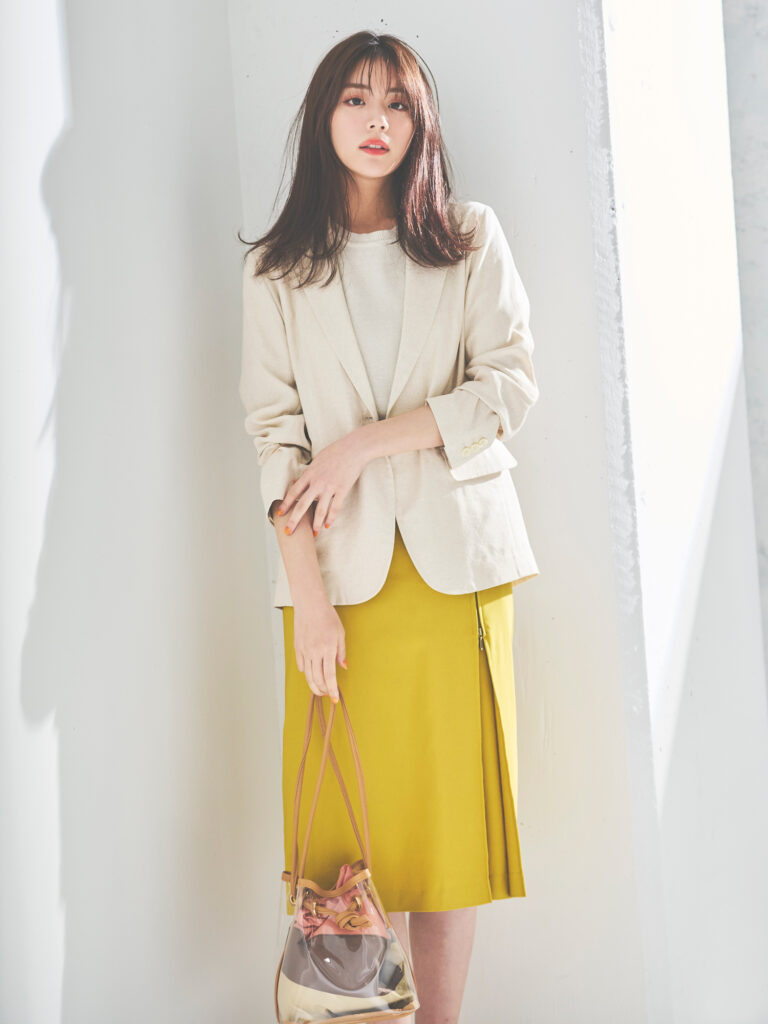 春のジャケットコーデに迷ったら、まずはテーラードジャケットと膝丈スカートを試してみて。