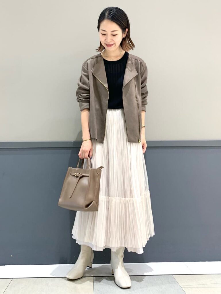 メンズライクなレザージャケットですが、あえてプリーツスカートなどの甘めのアイテムと合わせるのが今風コーデです。