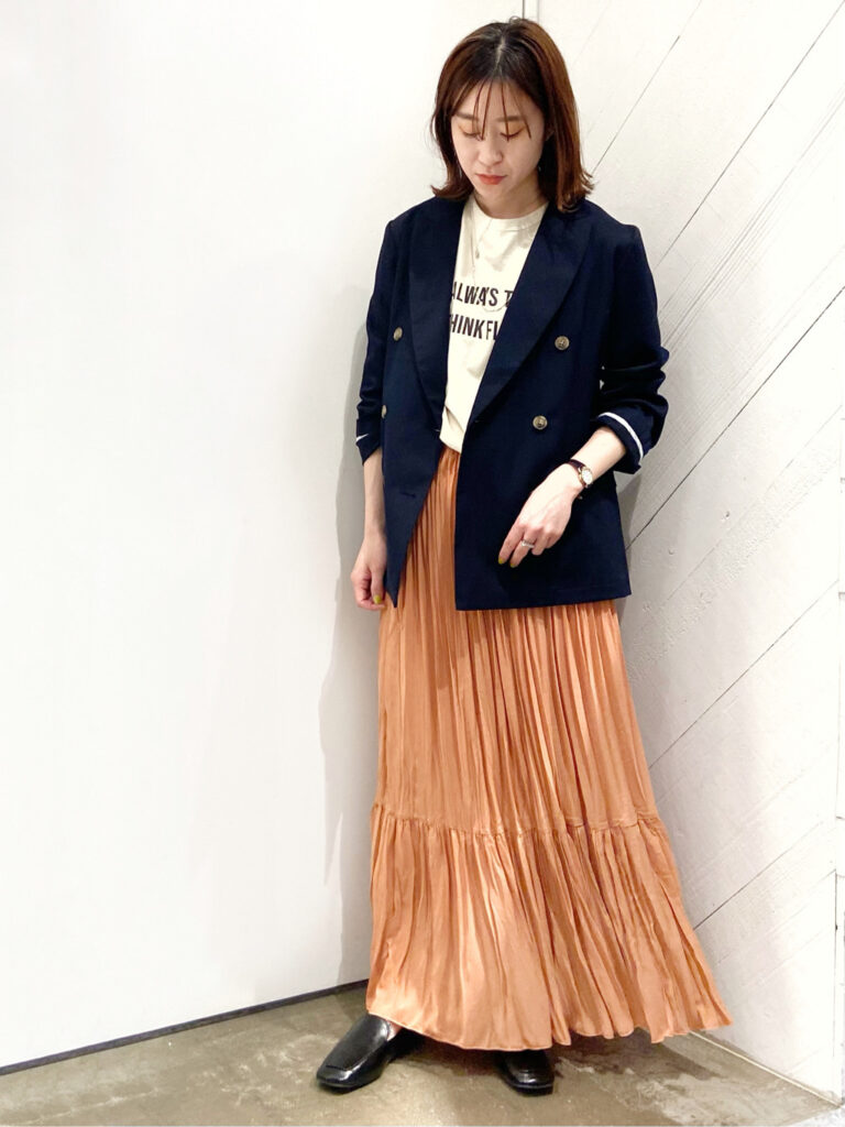 ボトムスはプリーツたっぷりのスカートを合わせれば、華やかで女性らしいコーデが完成。日々のオフィスカジュアルにおすすめの組み合わせです。