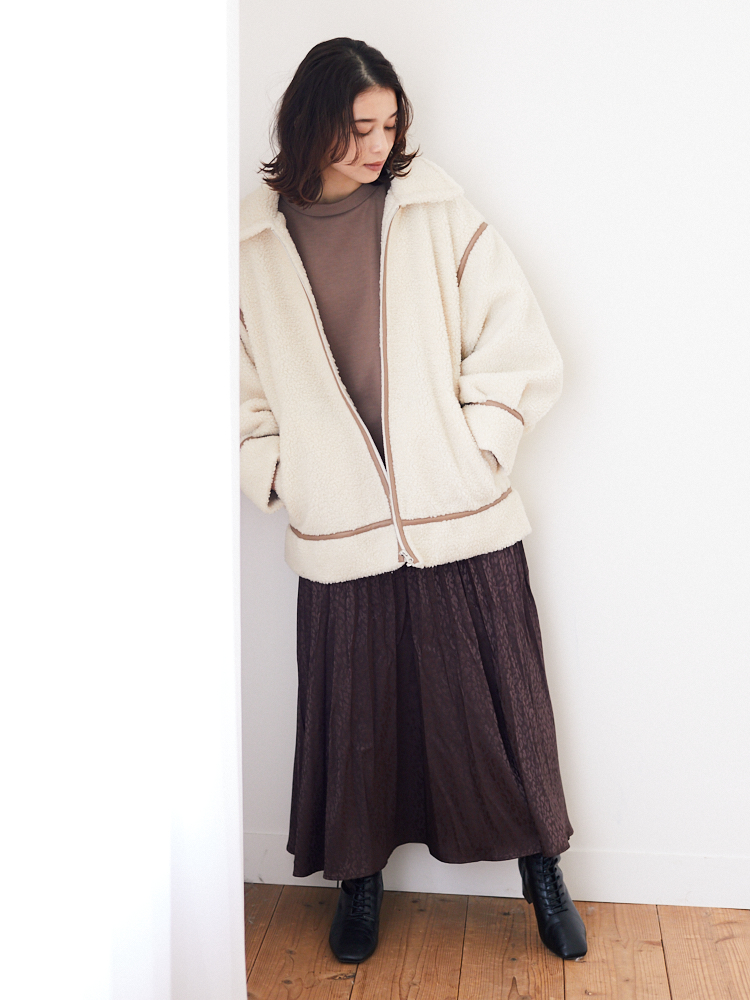 ボアジャケット×サテンスカート