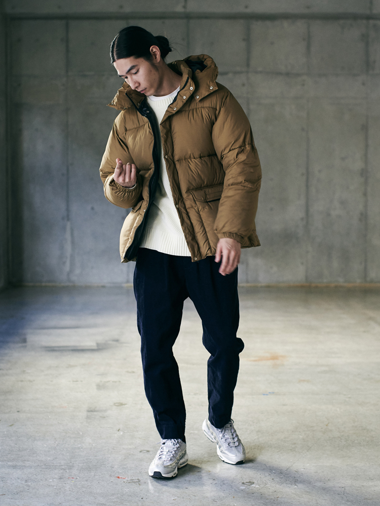 秋冬には、ダウンジャケットとコーデュロイパンツで季節感満載のコーデが完成。