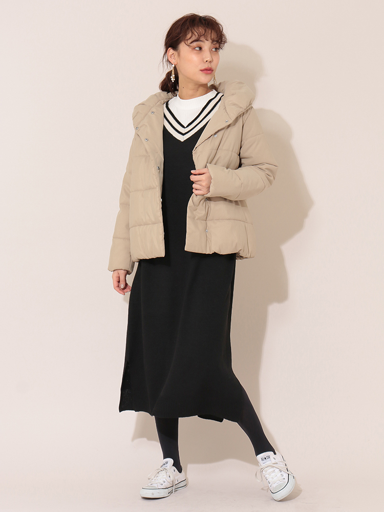 特に寒い日は、もこもこのファージャケットで首回りを防寒して暖かく過ごしましょう。冬に定番のニットワンピを合わせれば、暖かい上に全体のバランスも整います。