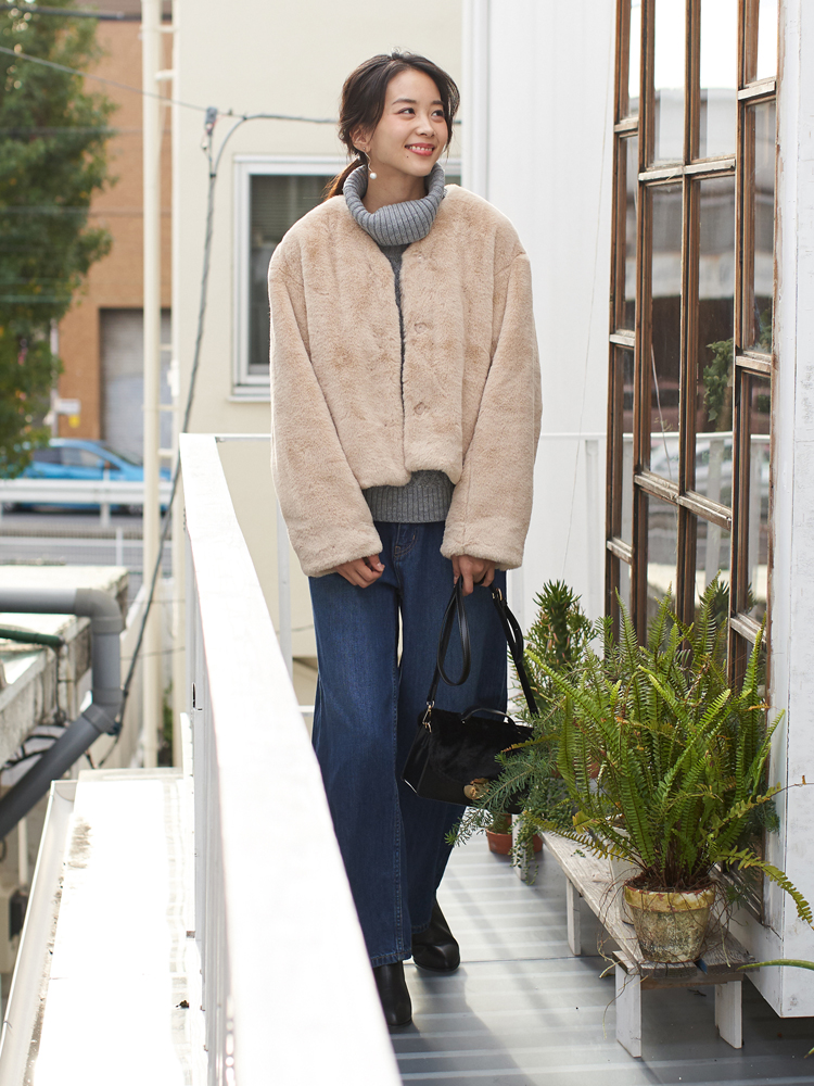 ファージャケットで上半身にボリューム感を持たせ、ボトムスにワイドパンツを合わせればゆったりとしたこなれ感のあるコーデが完成します。