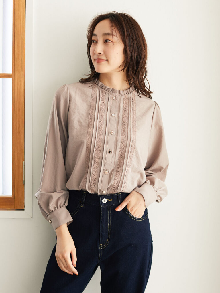 鮮やかな藍色のインディゴデニムには、ガーリーなブラウスを合わせてみてはいかがでしょうか。シンプルではありますが、バランスの取れた甘辛ミックスコーデになります。